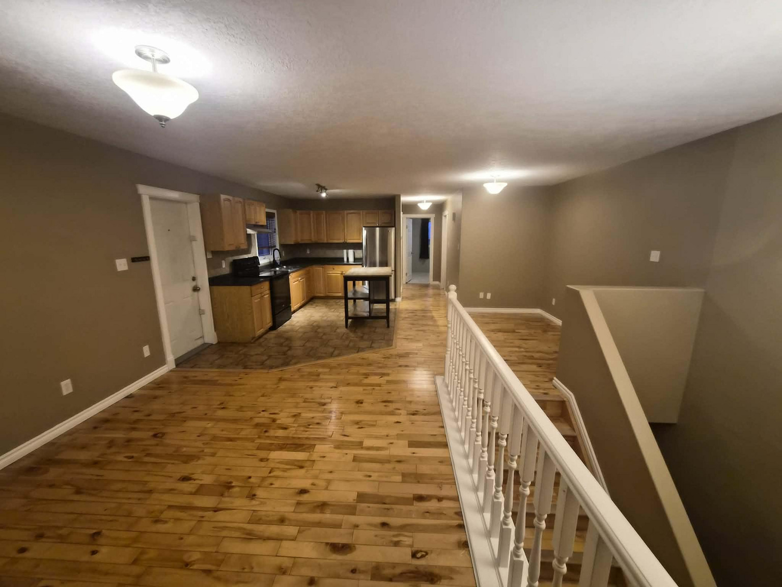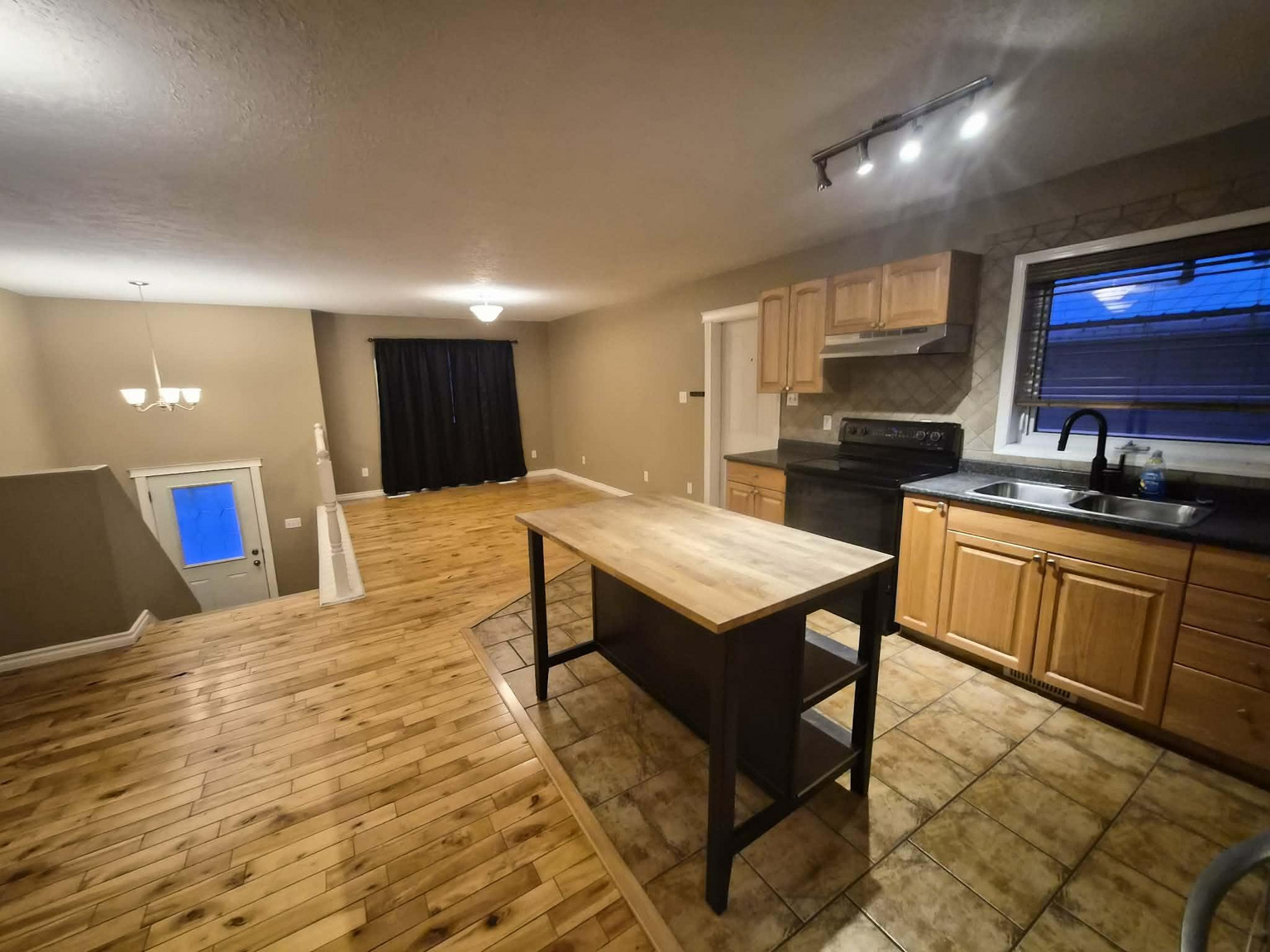 The main level features an inviting open-concept layout with hardwood flooring, a bright front window, and a functional kitchen with a side door—ideal for BBQ’ing. The kitchen includes appliances and a portable island, with a spacious dining area for easy meals and entertaining.
