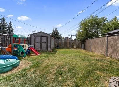 Fully fenced backyard with storage shed